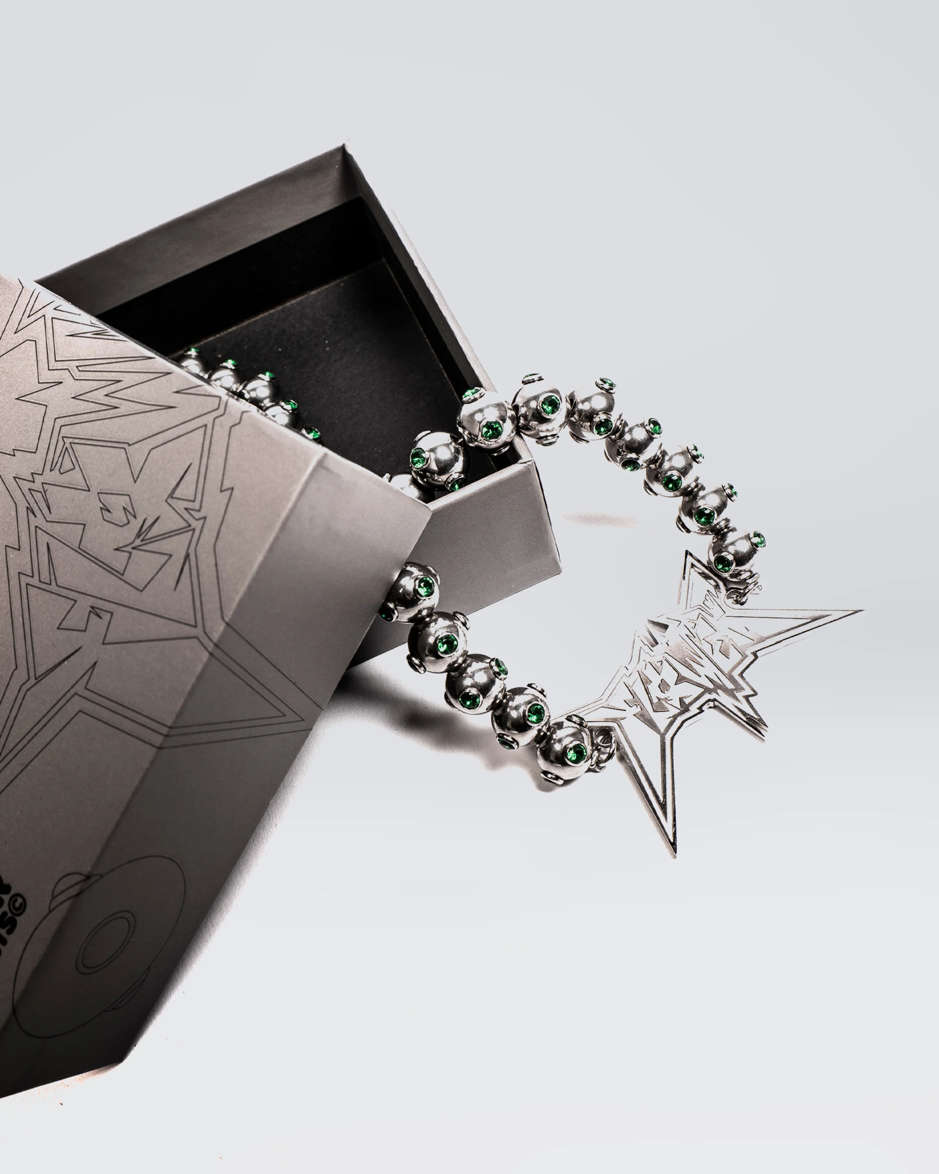 The innovation and creativity continues with unexpected embellishments in the form of green zirconia stones embedded skillfully into stainless steel pearls.